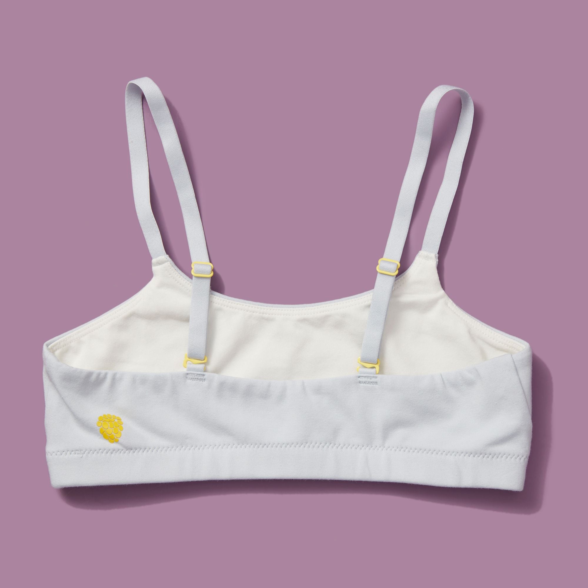Yellowberry Pipit First Training Bra. Super soft, all-natural cotton bra for girls. Best first bra. Made with antimicrobial, cotton, double-layered fabric. Offers full coverage for developing girls. Designed for girls and daughters with sensitive skin. High-quality materials, machine wash, and dry. Best training bra for active girls, tweens, and teens.
