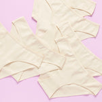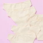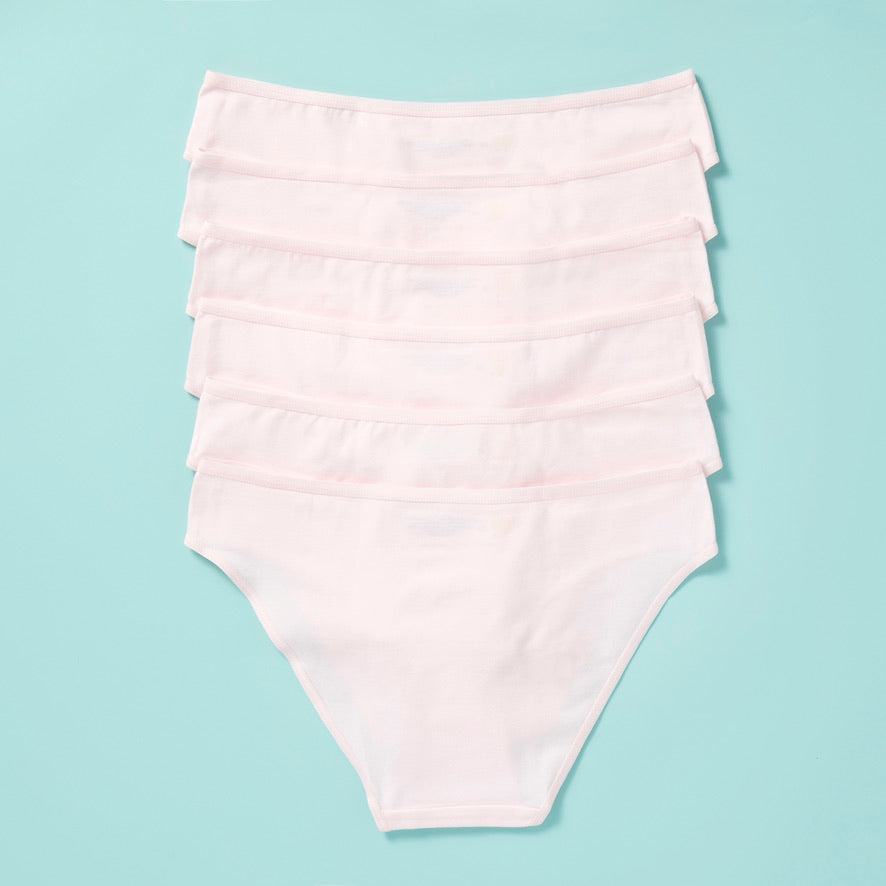 6 pair of beige girls cotton bikini cut underwear on a pretty pink background, front