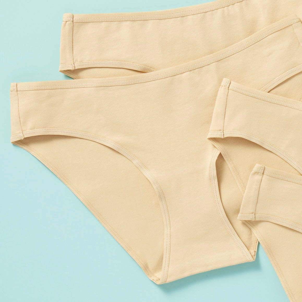 close up image of 6 pair of girls cotton bikini cut underwear on an aqua background, back
